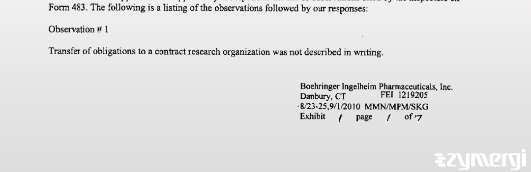 FDA inspected Boehringer Ingelheim Pharmaceuticals, Inc.'s Danbury site on Sep 01, 2010. See how they responded.