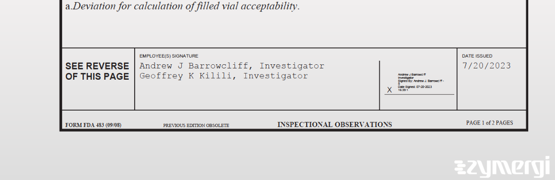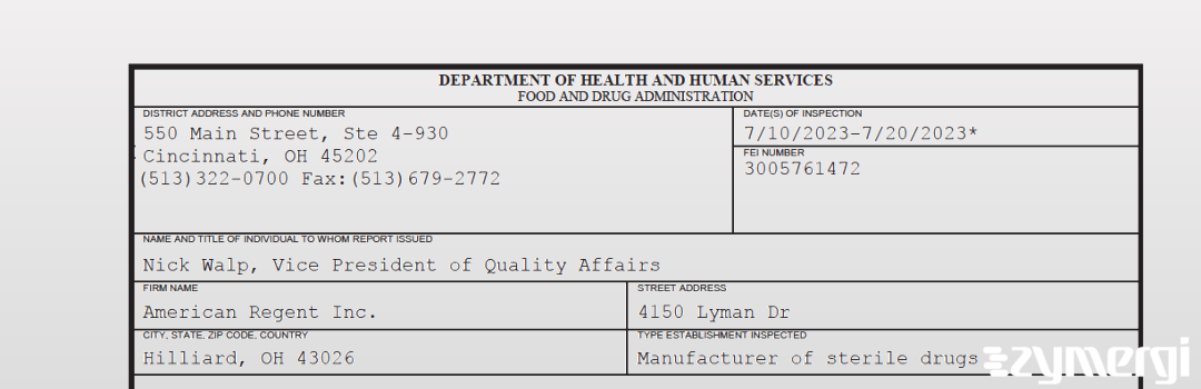 On Jul 20, 2023, the FDA inspected American Regent Inc.'s Hilliard site. Explore the inspectional observations.