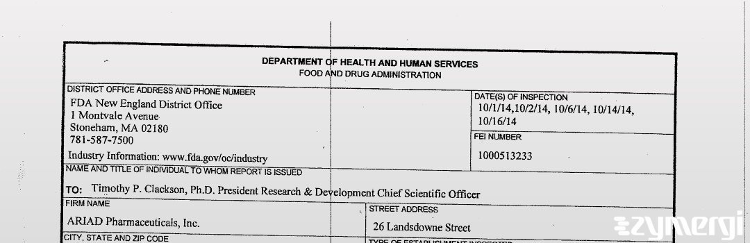 On Oct 16, 2014, the FDA inspected ARIAD Pharmaceuticals, Inc.'s Cambridge site. Explore the inspectional observations.