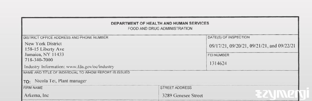 On Sep 22, 2021, the FDA inspected Arkema Inc's Piffard site. Explore the inspectional observations.