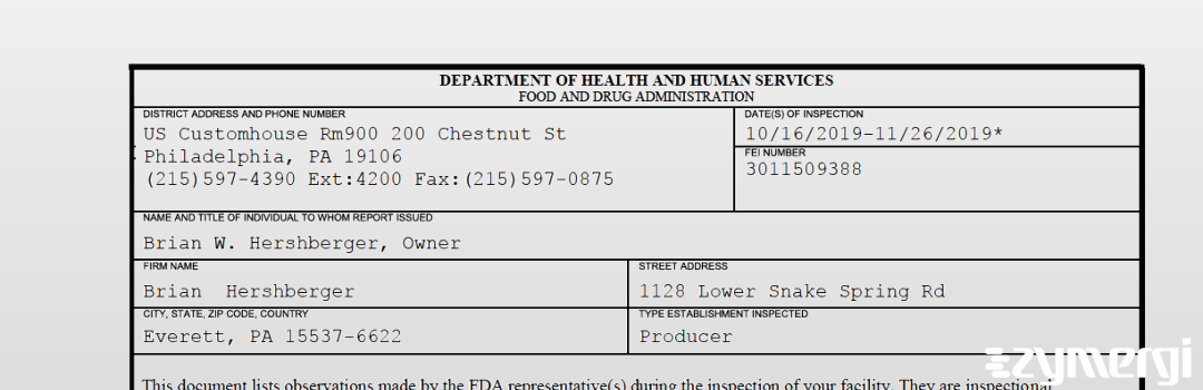On Nov 26, 2019, the FDA inspected Brian Hershberger's Everett site. Explore the inspectional observations.
