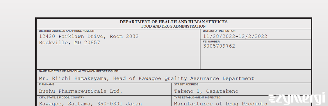 483 Document: Bushu Pharmaceuticals Ltd, Dec 2, 2022