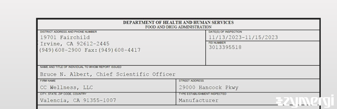 On Nov 15, 2023, the FDA inspected CC Wellness, LLC's Valencia site. Explore the inspectional observations.