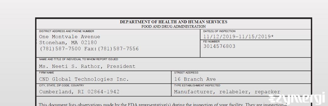 On Nov 15, 2019, the FDA inspected CND Global Technologies Inc.'s Cumberland site. Explore the inspectional observations.