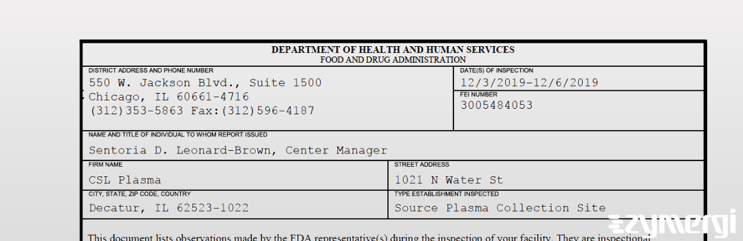 On Dec 06, 2019, the FDA inspected CSL Plasma's Decatur site. Explore the inspectional observations.