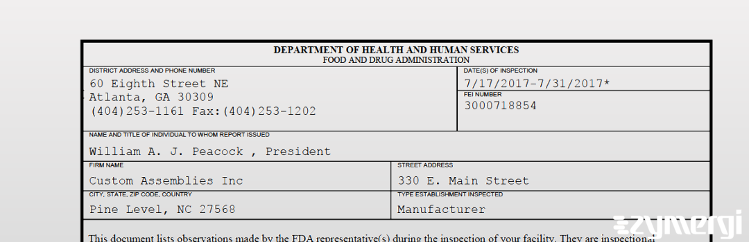 On Jul 31, 2017, the FDA inspected Custom Assemblies, Inc.'s Pine Level site. Explore the inspectional observations.