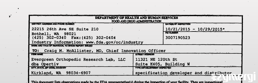 On Oct 29, 2015, the FDA inspected Evergreen Orthopedic Research Lab, LLC dba Opertiv's Kirkland site. Explore the inspectional observations.