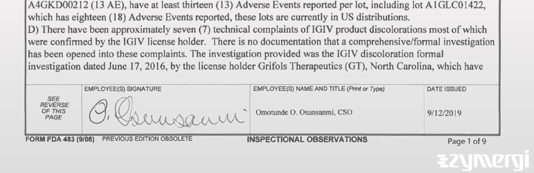 483 Document: Grifols Biologicals Inc., Sep 12, 2019