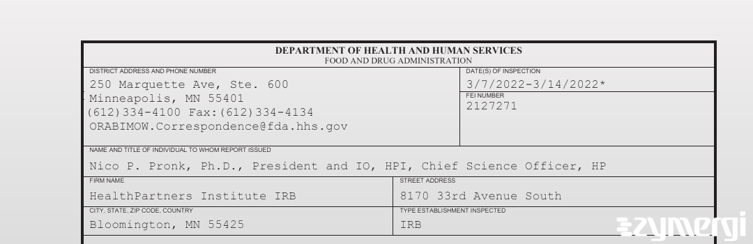 On Mar 14, 2022, the FDA inspected HealthPartners Institute IRB's Bloomington site. Explore the inspectional observations.
