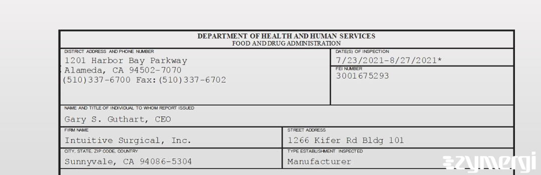 On Aug 27, 2021, the FDA inspected Intuitive Surgical Inc.'s Sunnyvale site. Explore the inspectional observations.