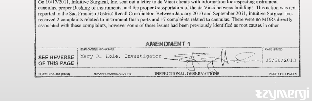On May 30, 2013, the FDA inspected Intuitive Surgical Inc.'s Sunnyvale site. Explore the inspectional observations.