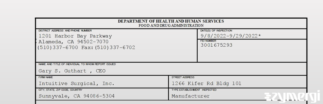 On Sep 29, 2022, the FDA inspected Intuitive Surgical Inc.'s Sunnyvale site. Explore the inspectional observations.