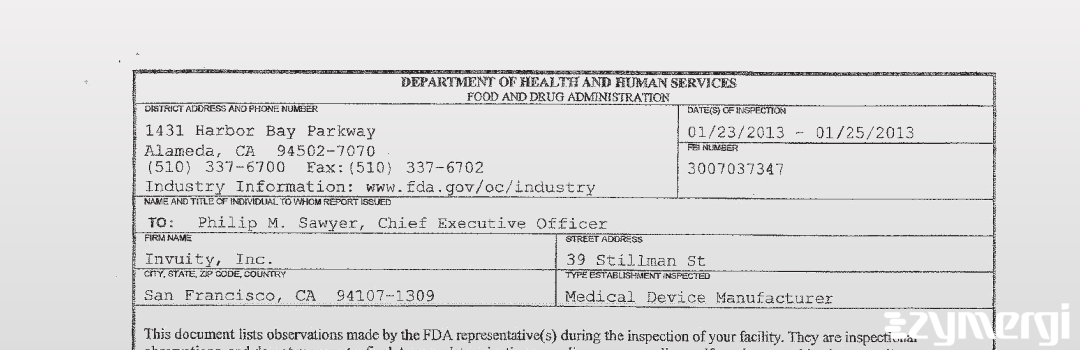 On Jan 25, 2013, the FDA inspected Invuity, Inc.'s San Francisco site. Explore the inspectional observations.