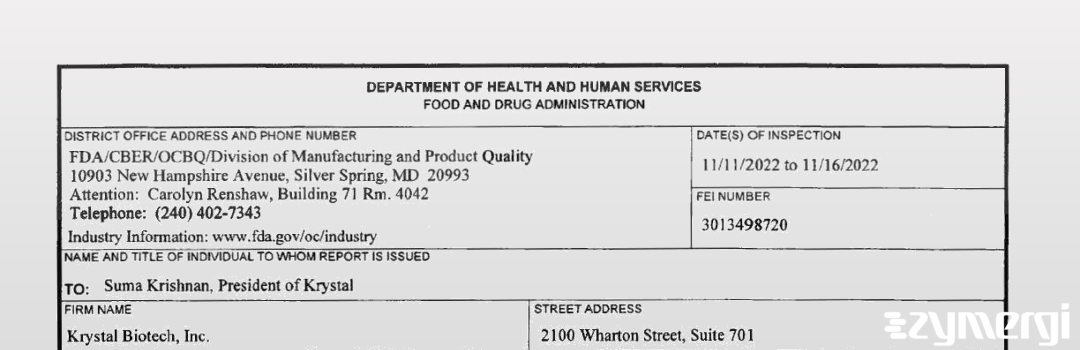On Nov 16, 2022, the FDA inspected Krystal Biotech, Inc.'s Pittsburgh site. Explore the inspectional observations.