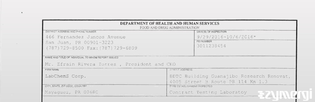 On Oct 06, 2016, the FDA inspected LabChemS Corp.'s Mayaguez site. Explore the inspectional observations.