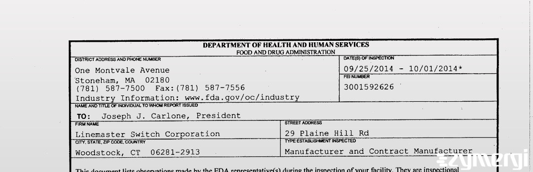 On Oct 01, 2014, the FDA inspected Linemaster Switch Corporation's Woodstock site. Explore the inspectional observations.