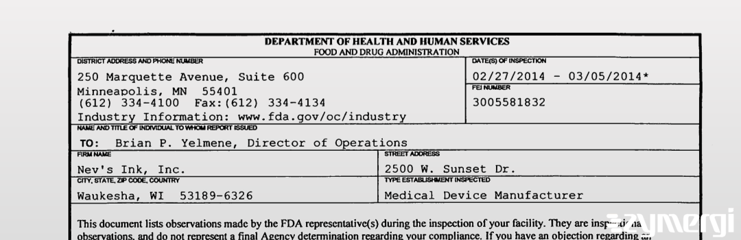 On Mar 05, 2014, the FDA inspected Nev's Ink Inc.'s Waukesha site. Explore the inspectional observations.