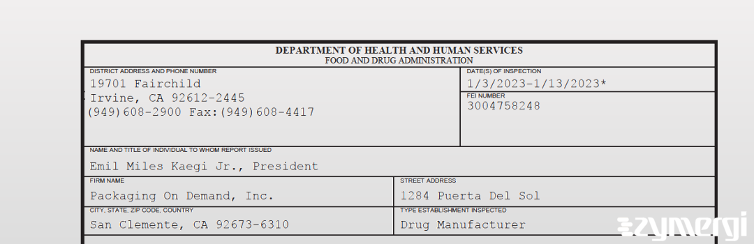 On Jan 13, 2023, the FDA inspected Packaging On Demand, Inc.'s San Clemente site. Explore the inspectional observations.