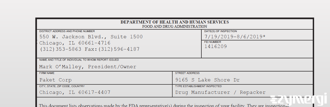 On Aug 06, 2019, the FDA inspected Paket Corp's Chicago site. Explore the inspectional observations.