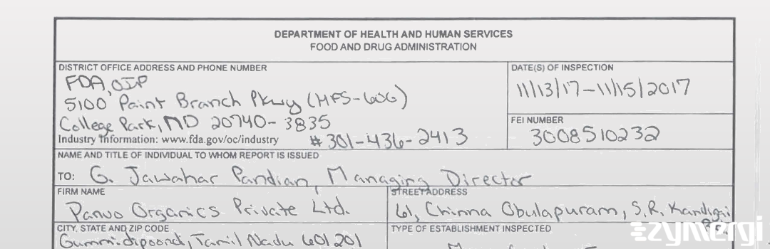 On Nov 15, 2017, the FDA inspected Panvo Organics Private Limited's Chinnaobulapuram site. Explore the inspectional observations.