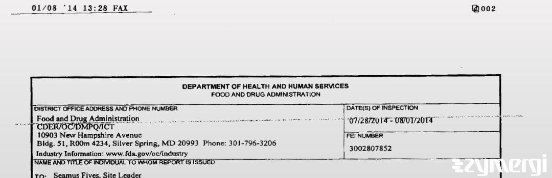 483 Document: Pfizer Ireland Pharmaceuticals Inc., Aug 1, 2014