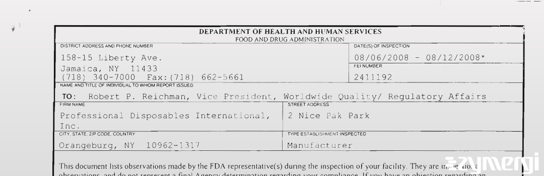On Aug 12, 2008, the FDA inspected Professional Disposables International, Inc.'s Pearl River site. Explore the inspectional observations.