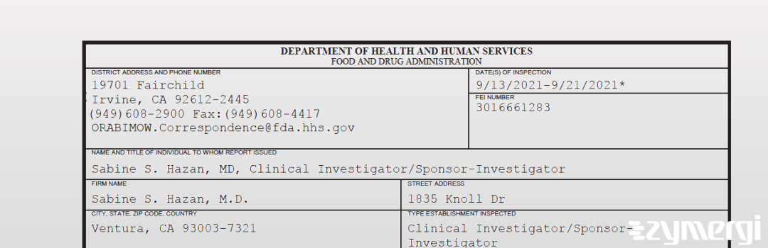 On Sep 21, 2021, the FDA inspected Sabine S. Hazan, M.D.'s Ventura site. Explore the inspectional observations.