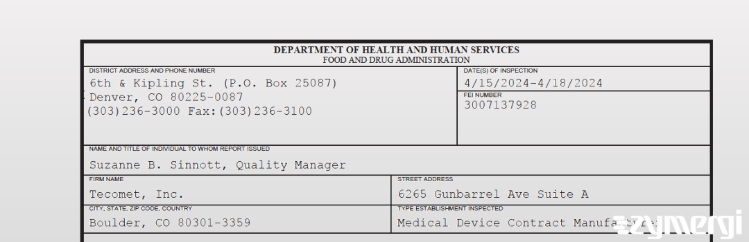 On Apr 18, 2024, the FDA inspected Tecomet Inc.'s Boulder site. Explore the inspectional observations.