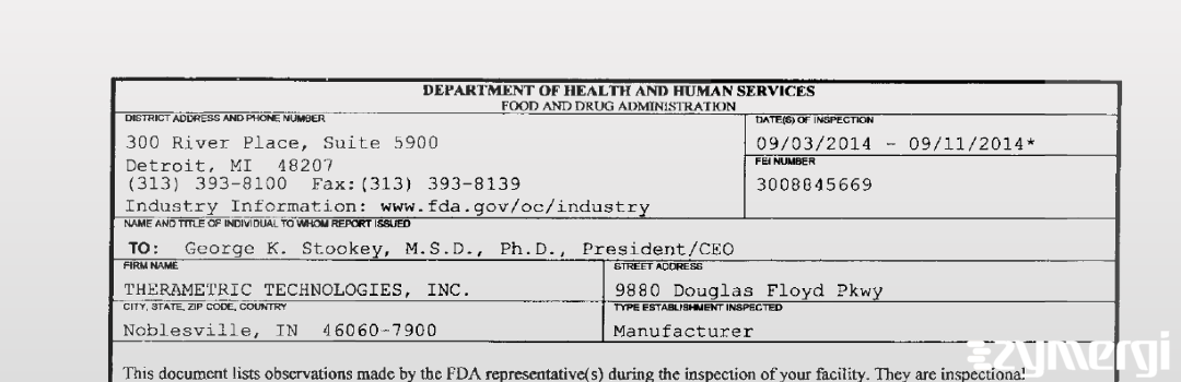 On Sep 11, 2014, the FDA inspected Therametric Technologies, Inc.'s Noblesville site. Explore the inspectional observations.