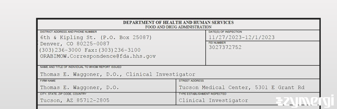 On Dec 01, 2023, the FDA inspected Thomas E. Waggoner, D.O.'s Tucson site. Explore the inspectional observations.