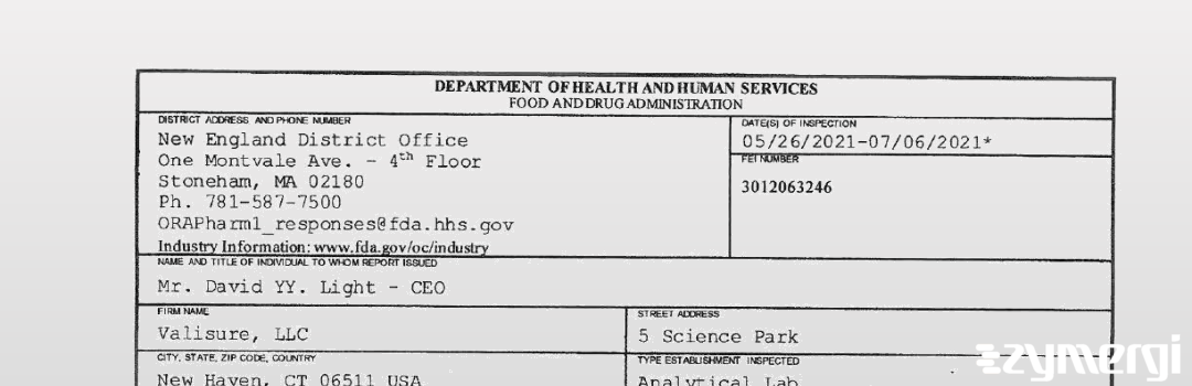 On Jul 06, 2021, the FDA inspected Valisure, LLC's New Haven site. Explore the inspectional observations.