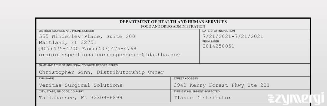 On Jul 21, 2021, the FDA inspected Veritas Surgical Solutions's Tallahassee site. Explore the inspectional observations.